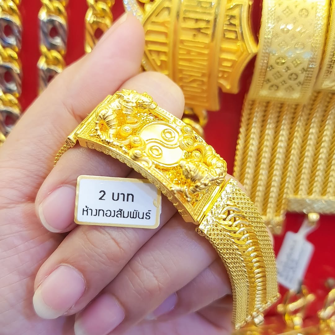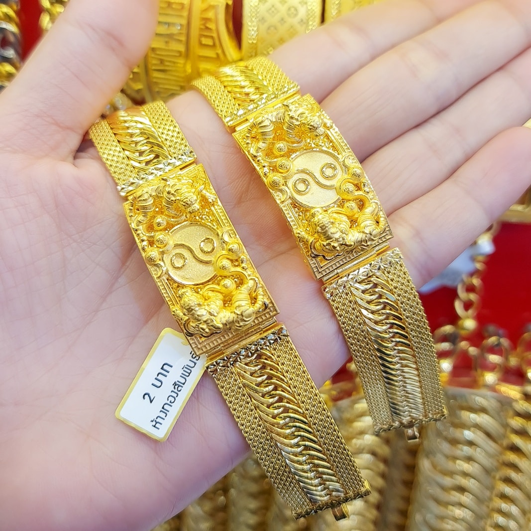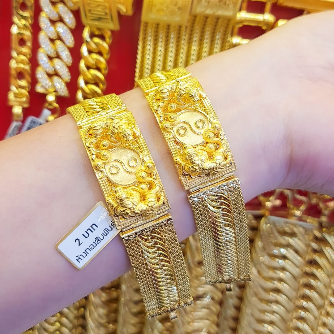 This Solid 23K Gold Bracelet weighs 30.4g. This Thailand Gold Jewelry features a symbolic Yin Yang central piece flanked by two highly detailed Imperial Dragons. The band is crafted in a wide, durable Mesh Link style. We guarantee the purity is 96.5% gold.
