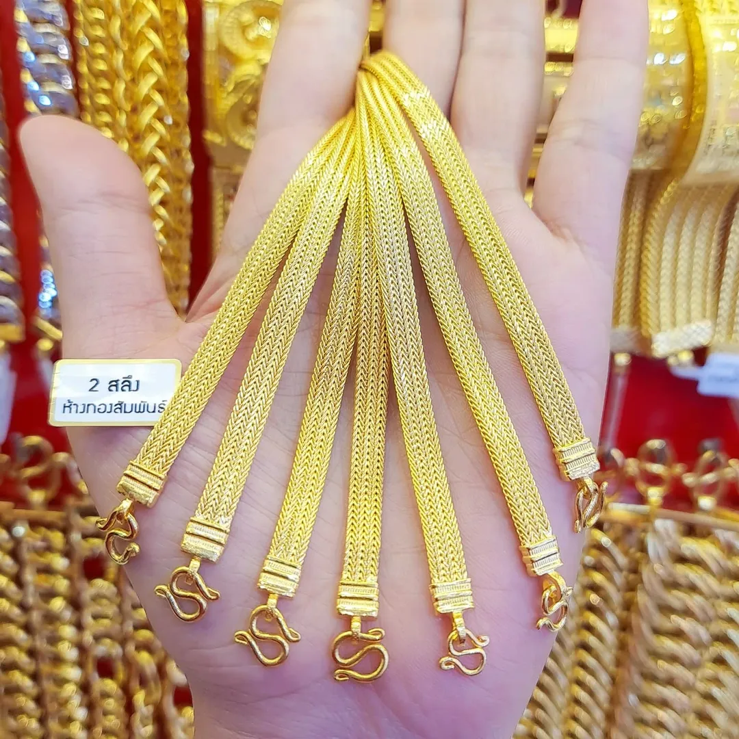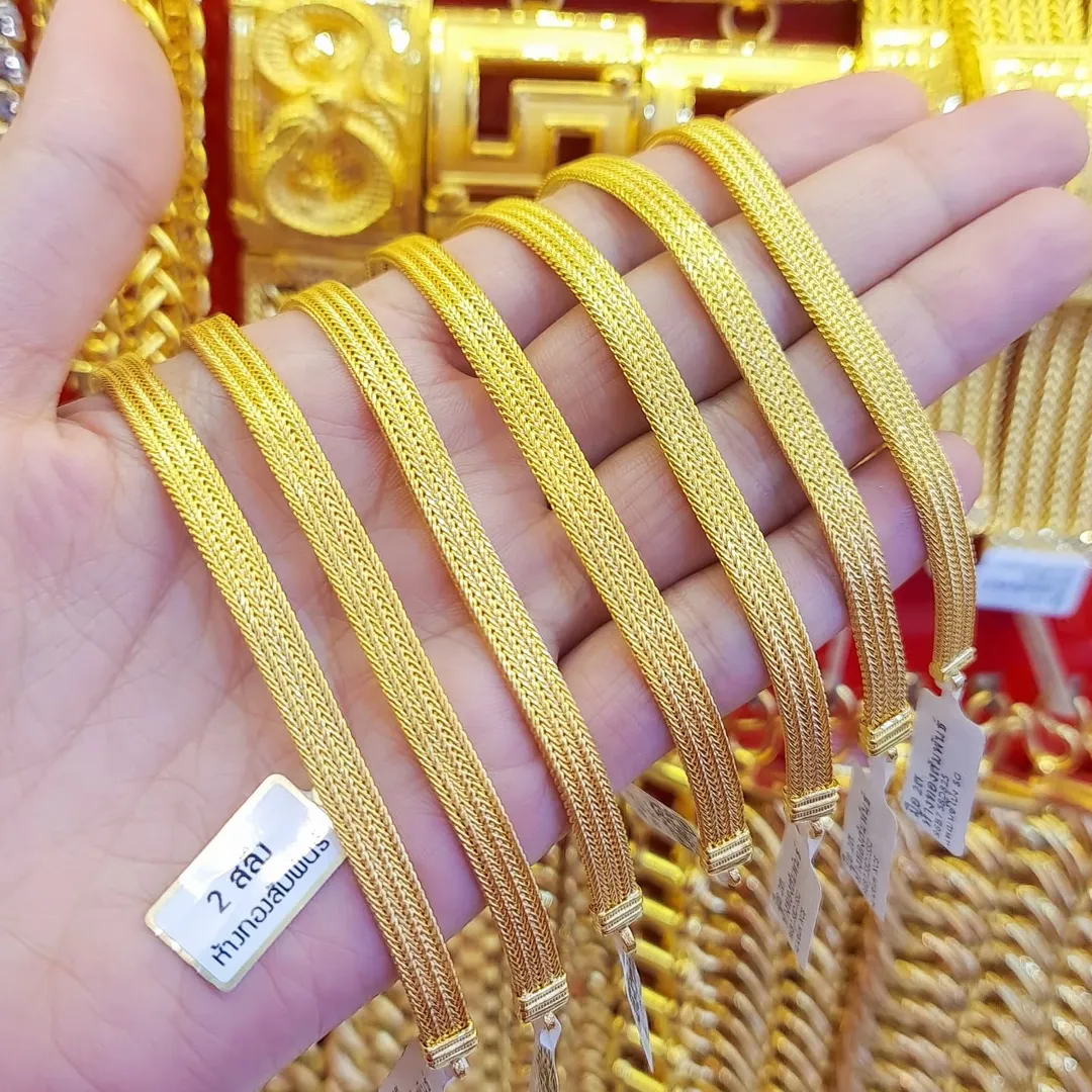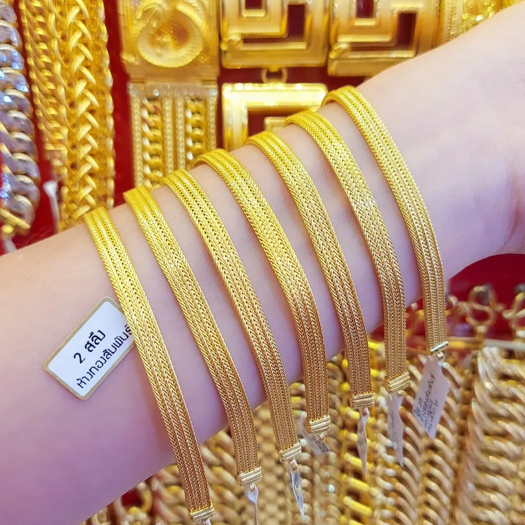 This Solid 23K Gold Bracelet weighs 7.6g. This Thailand Gold Jewelry features a Flat Braid design with a rectangular interlocking pattern. We guarantee the purity is 96.5% gold.